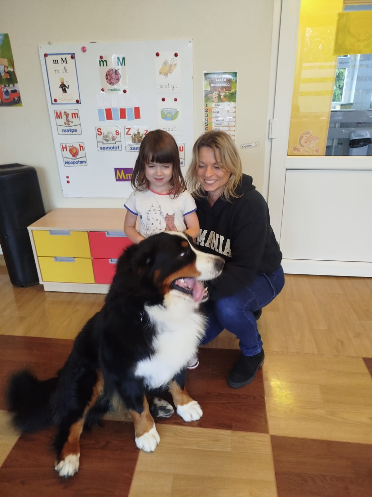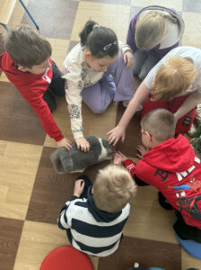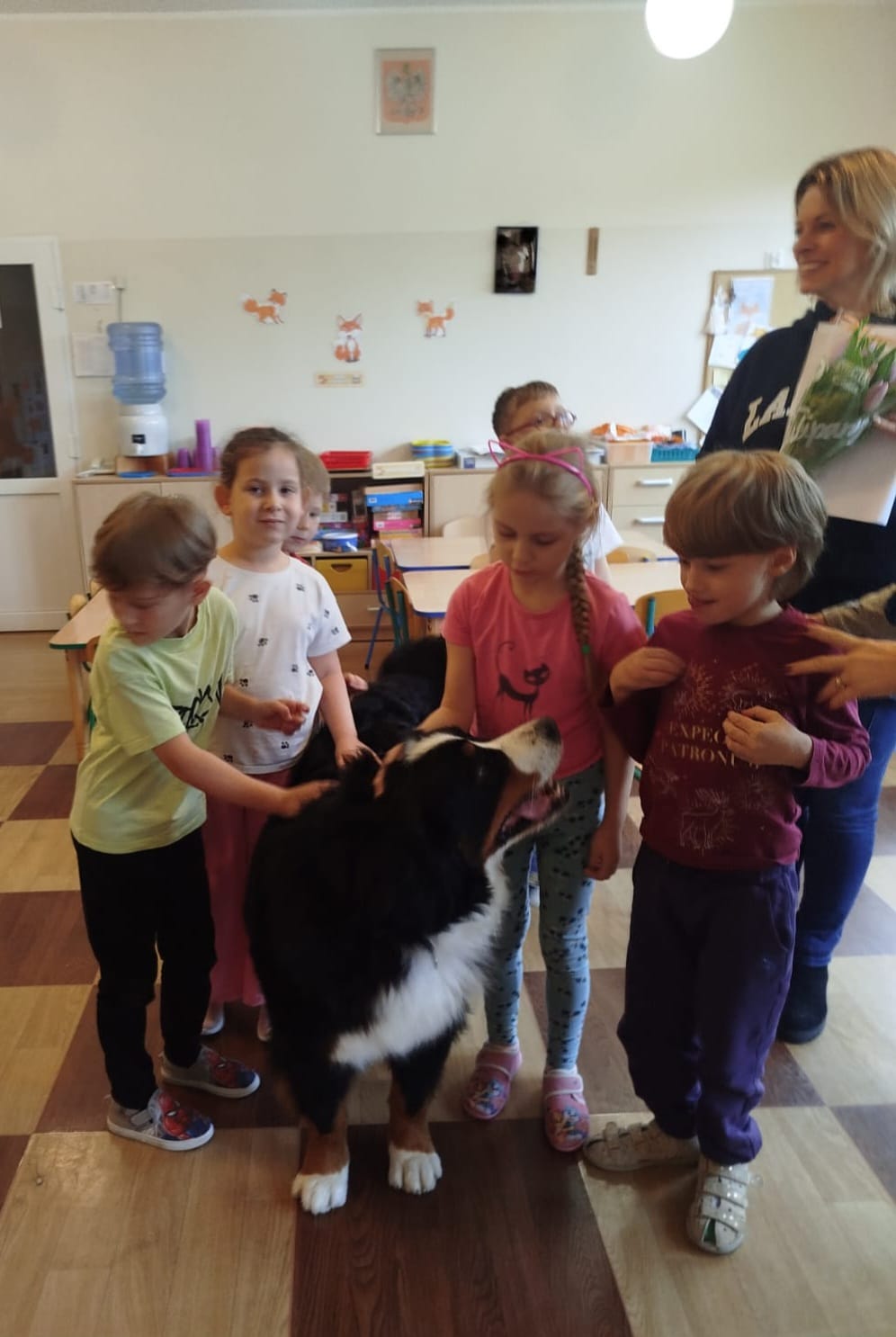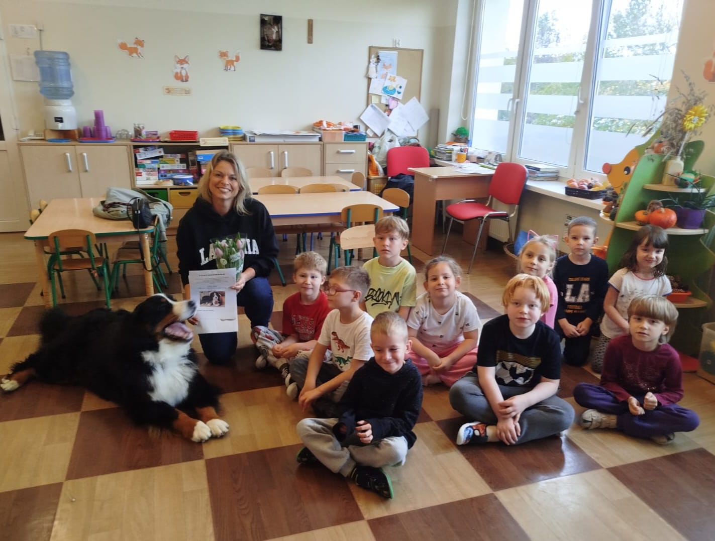 W październiku odwiedziła nas pani Mirka ze swoim pięknym psem pasterskim berneńskim Papayą, który był duży, puszysty i bardzo przyjazny 🐕. Wszyscy mieliśmy ochotę go pogłaskać i poczęstować psim smakołykiem.