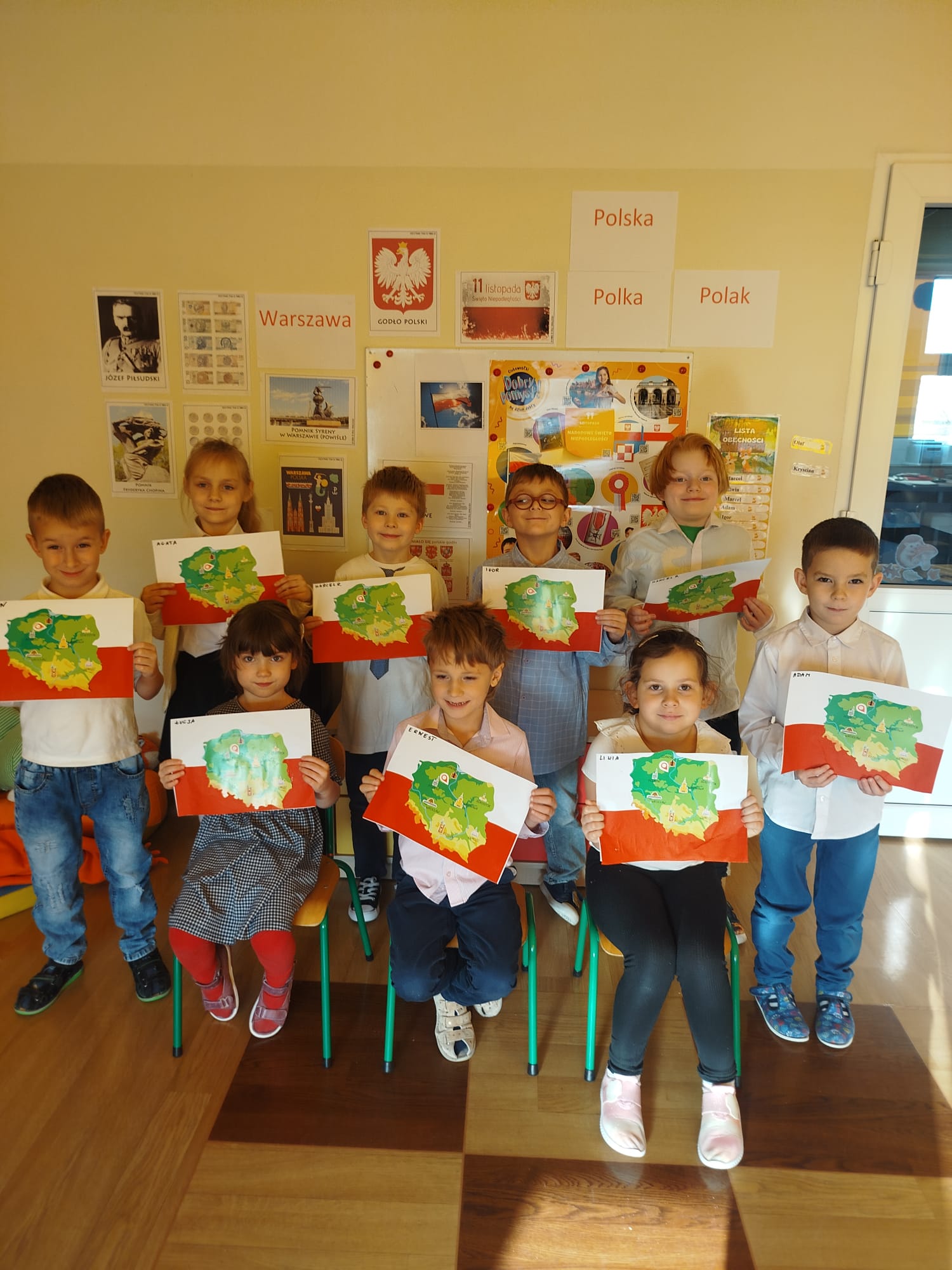 a potem zaśpiewaliśmy wspólnie hymn państwowy. Później wykonaliśmy pracę plastyczną naklejając kontur Polski na biało- czerwone tło.