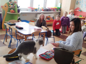 17 lutego, przy okazji Dnia Kota, gościliśmy w przedszkolu jednego z nich 😄🐈⬛. Głaskaliśmy jego miękkie futerko, częstowaliśmy kocimi smakołykami i obserwowaliśmy, jak zapoznaje się z nowym terenem, czyli naszą salą. Miło spędzimy czas z naszymi gościem 🤩🐈.